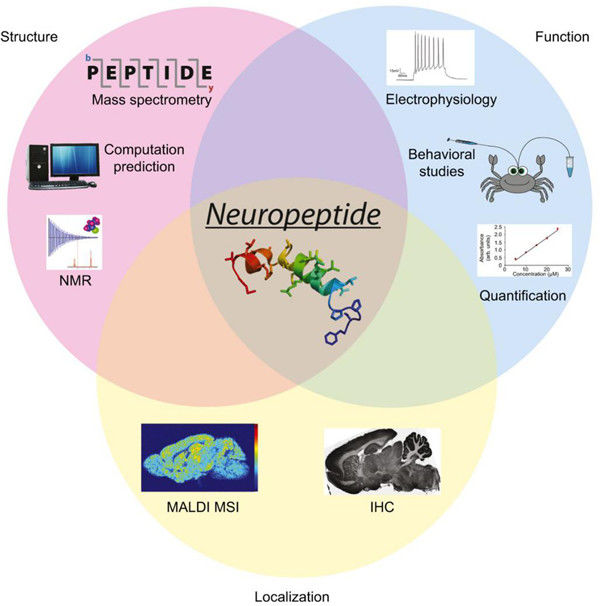 神經肽是由稱為前原肽的大而無活性前體蛋白合成的,該蛋白被切割成幾種活性肽。前原肽通常產生相同肽或許多不同肽的多個拷貝。肽序列的重復數經常在整個進化過程中發生變化,并成為遺傳變異的溫床。大腦中的肽表達可能具有高度選擇性和特異性。與選擇性表達相反,肽活性可能是廣泛而持久的。神經肽通常與其他肽和傳統的神經遞質共釋放。