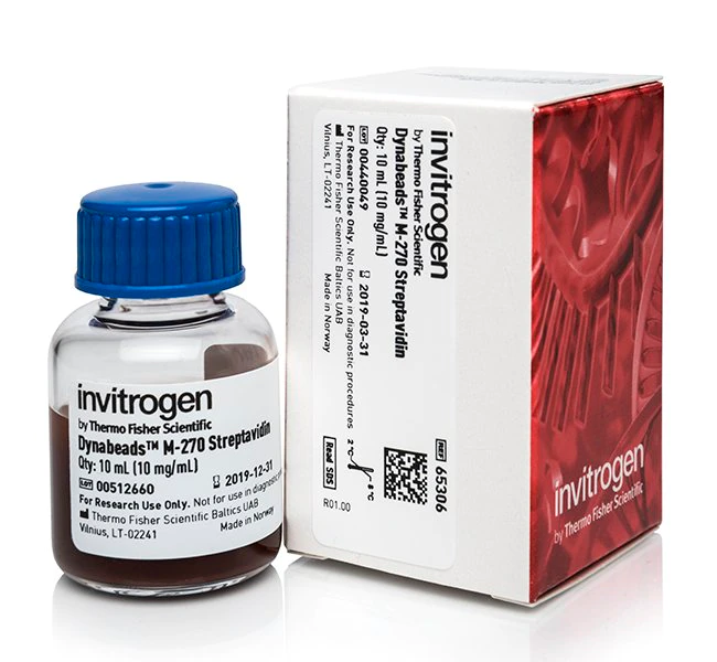 Dynabeads? M-270 鏈霉親和素是生物素化核酸、抗體或其他生物素化配體和靶標分離和處理的金標準。鏈霉親和素-生物素相互作用的極高結合親和力 (Kd=10-15)已在大量應用中使用。優點及特性:
